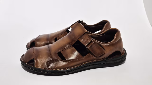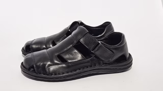 Muška sandala od prirodne kože, sa jagnjećom postavom, poliuretanskim đonom, i specijalnom tabanicom od memorijske pene za dodatnu udobnost.